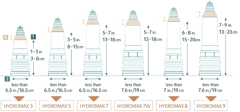 Choose by BPEL (erect length) first, then use mid-shaft girth as the tiebreaker. Common fits: Hydromax5 (~<5"), Hydromax7 (~5–7"), Hydromax9 (~7–9"), with 7 Wide Boy for larger girth (≈ 5.5–6.5"+).